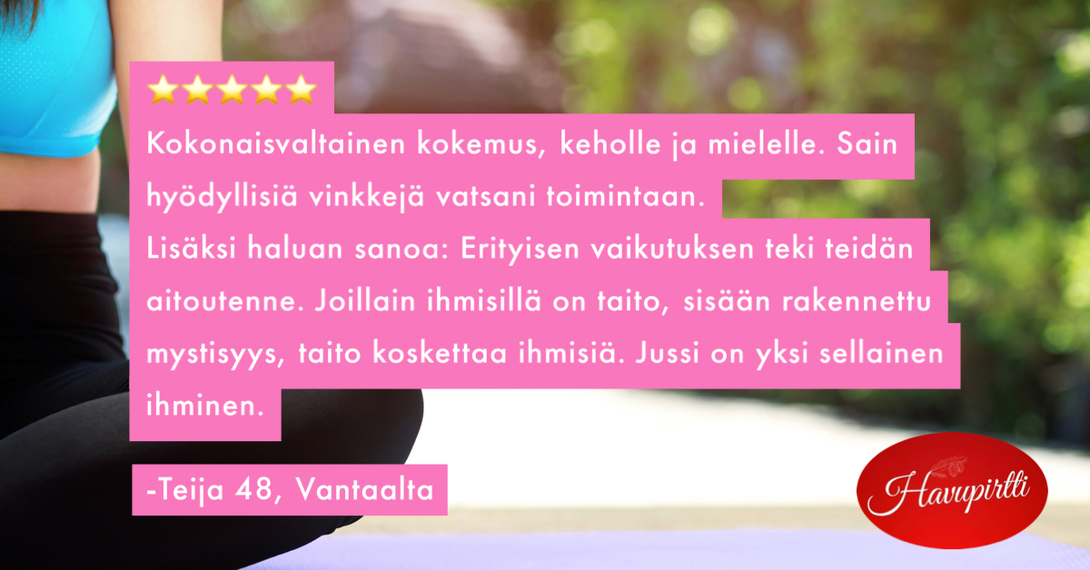 "Olin keväällä hyvinvointikurssilla Havupirtissä, enkä pitänyt itseäni kovin sairaana, vähän ummetusta ja vatsaongelmia. Halusin vain huoltaa ja putsata kehoani, tehdä ns, kehon vuosihuollon. Ravintoterapia vastaanotto oli melkoinen yllätys, kun Jussi osasi kysyä juuri sellaiset kysymykset, joihin vastatessani ymmärsin asioita elämästäni, joita en ollut tiedostanut edes ongelmiksi, jotka ovat voineet heijastua myös suoliston toimintaani."
